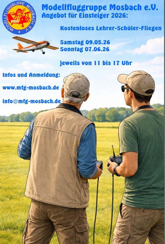 Wir bieten Einsteigern und interessierten Personen die Möglichkeit, Modellflug „live“ kennenzulernen und nach Absprache beim Lehrer-Schüler-Fliegen die ersten Flugversuche zu machen. In diesem Fall steuert ein erfahrener Pilot das Schulungsmodell und der Flugschüler kann Schritt für Schritt Steuerfunktionen erlernen. Dafür werden zwei Fernsteuer-Sender entweder per Kabel oder per Funk miteinander verbunden. Der Lehrer kann jederzeit eingreifen, oder auch die Kontrolle über das Flugmodell komplett übernehmen.