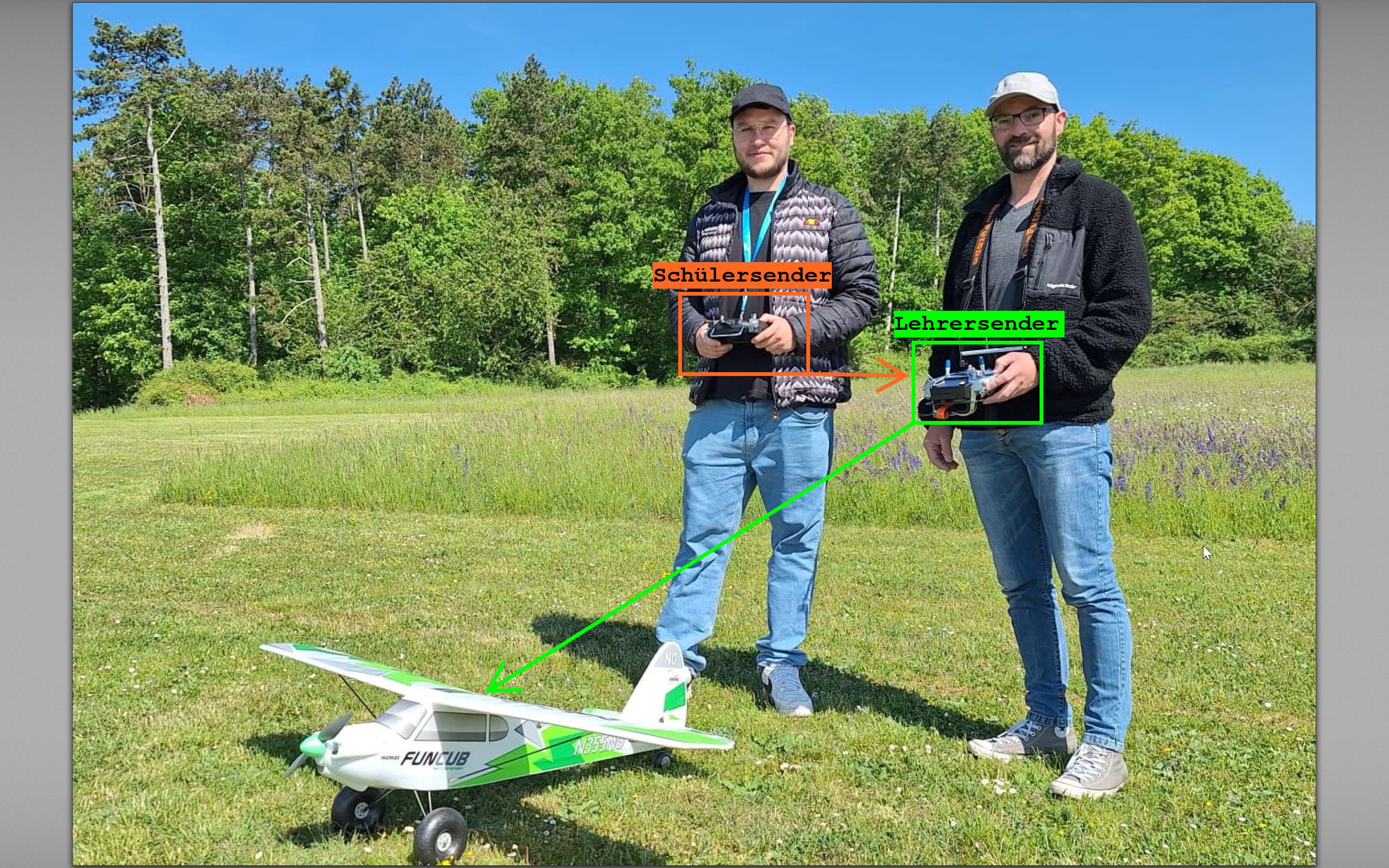 Als Verein haben wir eine komplette Lehrer-Schüler-Ausrüstung zur Verfügung. Wir schulen mit einer Multiplex „FunCub NG“. Dieses Modell bietet für Anfänger und auch für sehr erfahrene Piloten umfassenden Flugspaß. Zudem wird die FunCub in verschiedenen Versionen auf dem Gebrauchtmarkt oft sehr günstig angeboten. Der Schüler hat somit die Möglichkeit, nach der erfolgreichen Schulung mit dem gleichen Modell weiterzufliegen. Wir können jeden beliebigen Stick-Mode schulen. Es ist auch möglich, dass der Schüler einen anderen Mode fliegt, als der Lehrer.
